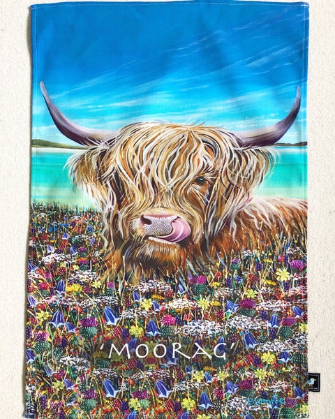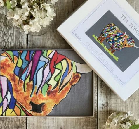 Chloe Gardner£15.95About this product Chloe's colourful bright highland cow design on a high-quality tea towel. The tea towel is 100% cotton, machine washable and me...