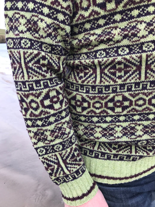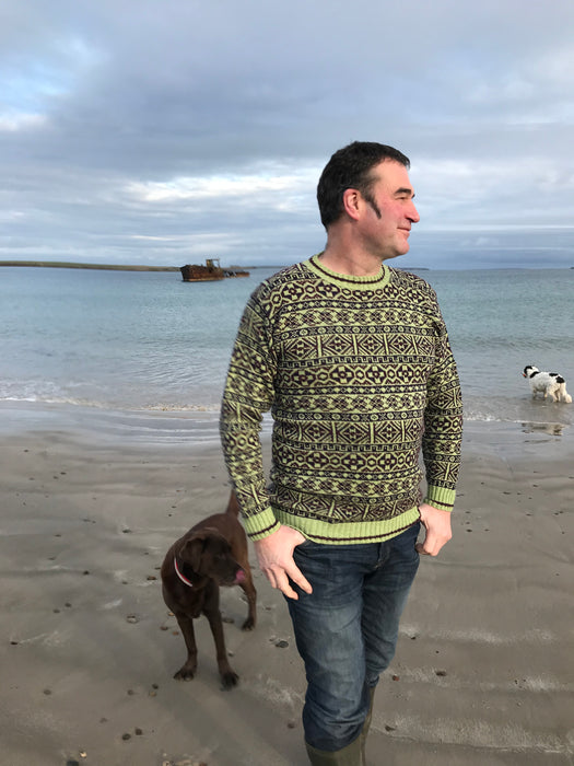 Designed by Judith and made in Orkney by one of her experienced knitters based in their own home, this traditional fair isle patterned crewneck sweater is made with soft Scottish lambswool with a mix of Italian boucle and mousse yarn. This crewneck sweater is suitable for men and women and has a ribbed stripey neckline, cuffs and welt. It is soft and lightweight to wear but very warm.