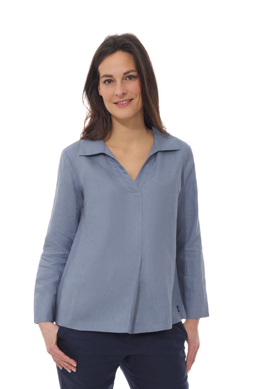 Description : Women's long-sleeved blouse in 100% linen. Cut: Slightly flared cut, Hawaiian collar with low crossover V-neckline. Details : Slit ...