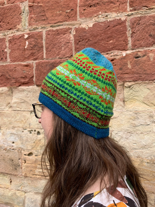This lovely pull on hat has been designed by Judith Glue and the colours and textures have been influenced by the beautiful Sea Grass which is a flowering plant which form meadows under the sea in shallow coastal areas. The meadows are extremely important as hosts for many different animals. Mapping has been on going in Orkney for a few years where there is a key part of the work to protect this valuable marine ecosystem happening.