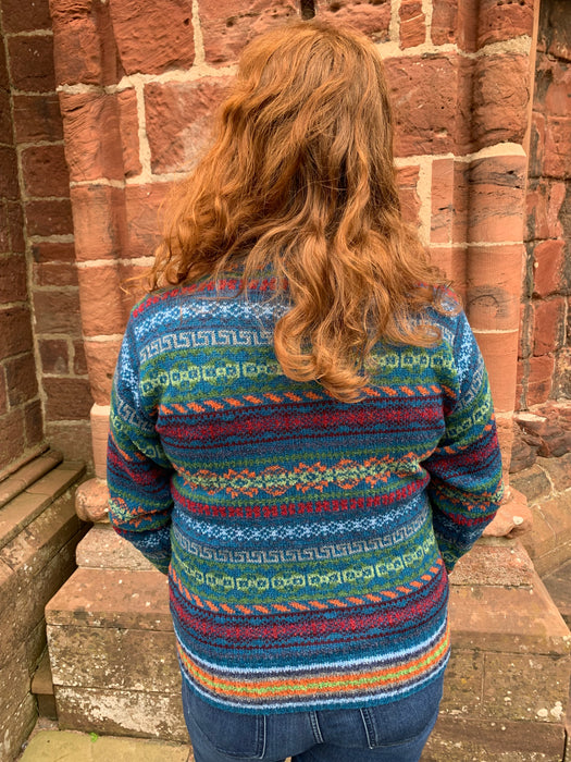 This Rackwick short sweater with striped cuffs and welts and a lovely curl neck has been designed by Judith and influenced by the colours and textures you see in Rackwick in Hoy - Judith's favourite place to visit. This is made in Orkney by one of her experienced knitters based in their own home, this traditional fair isle patterned sweater has been made with Scottish lambswool with a mix of Italian boucle and mousse yarn. It is unisex and is suitable for men or women. Please see the rest of the Rackwick collection.