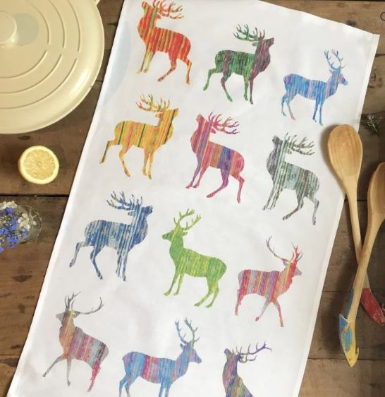 These tea towels are beautifully printed bright coloured teatowels . A 100% cotton tea towel with a multi stag design on it including 12 stags.