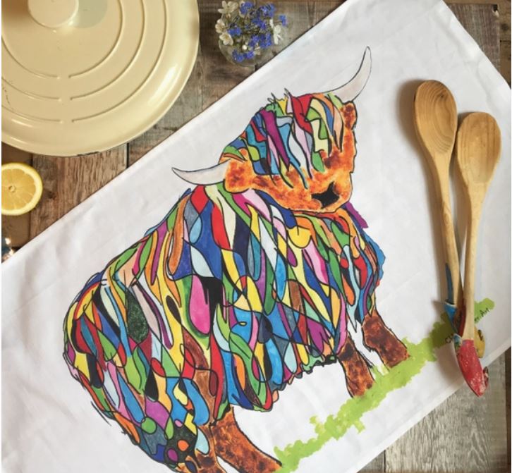 Chloe's colourful bright highland cow design on a high-quality tea towel. The tea towel is 100% cotton, machine washable and measures 70x50cm. Tea towel is specially folded to highlight design.