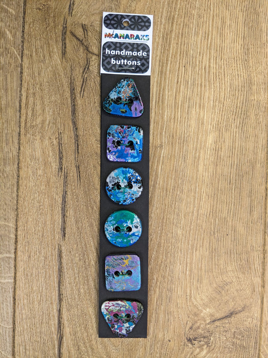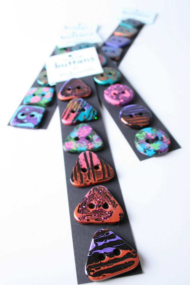 These Beautiful,Vibrant buttons are made in the Highlands of Scotland by McAnaraks. The buttons are made from resin and then poured and decorated by hand making each button individual. Please note that when you order these buttons they will not be exactly the same colours as in the pictures as each set are slightly different. You can get either Mixed Shapes, Round, Square, Triangle, Heart or Star sets.