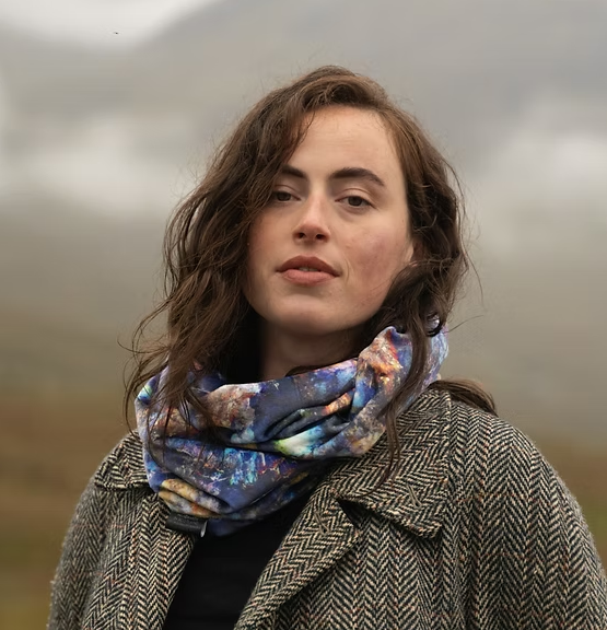 A beautifully soft, plush velvet infinity scarf featuring the print 'LABRADORITE', a brand new design for 2024. Featuring microscopic imagery of the mineral of the same name. Labradorite is often compared to the Aurora Borealis which April was lucky enough to see in Scotland this year and this inspired the colour palette. These luxury infinities are available in a full selection of prints inspired by geology and pattern found in the natural world. Printed using sustainable methods and handmade in her studio in Glasgow.