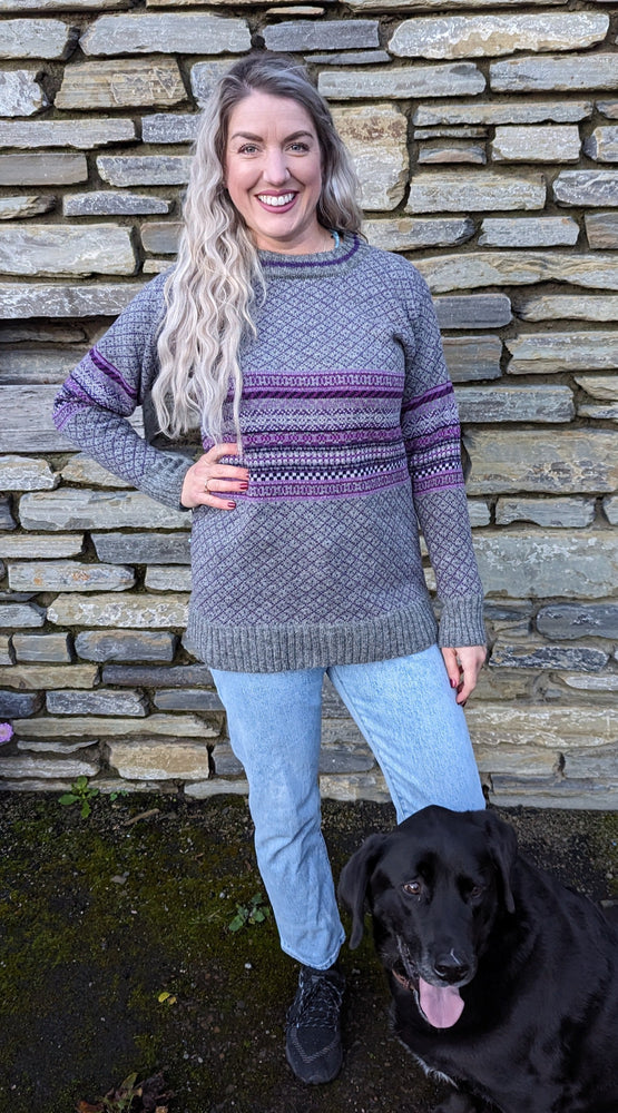 The Odds and Ends design is new for 2023. Every jumper is unique as the idea behind these is that everyone deserves a one off the main colours will be the same in this lovely soft grey and royal purple but the other colours in the middle band will vary but will made up of colours that compliment one another.