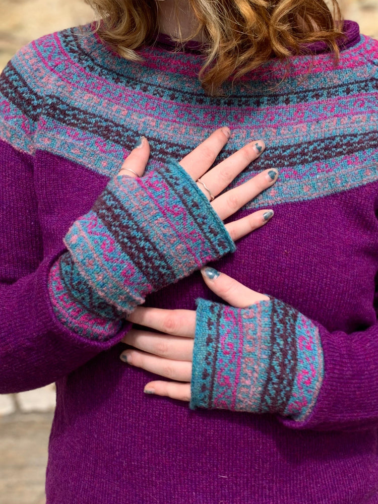 This gorgeous fingerless mittens is lovely and warm made from super soft Scottish lambs wool and Italian merino. The colour way is Sea pinks (Armeria maritima) which takes its name from a flower found on the cliff tops in orkney.  This traditional style pattern has taken influences from Orkneys rough stormy seas. Each one is made to order in Orkney by Annie Glue.