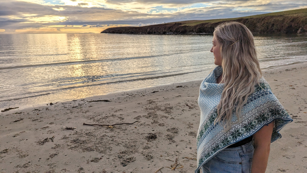 This lovely Poncho is in the North Star fairisle which is influenced by Orkneys connections with Norway. The Poncho is made and designed by Annie Glue in her peedie studio in the heart of Kirkwall using 100% super soft Scottish lambswool.