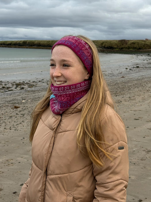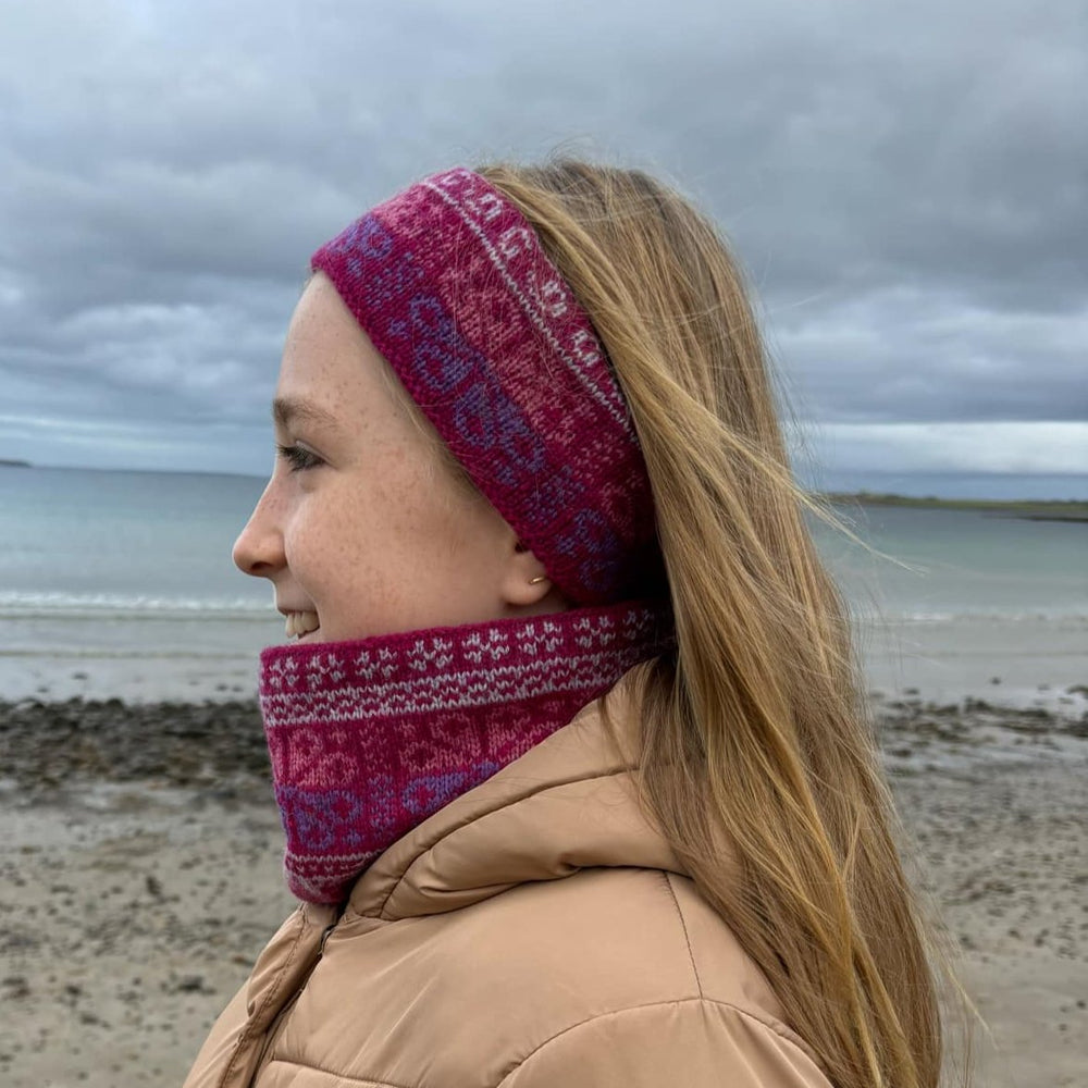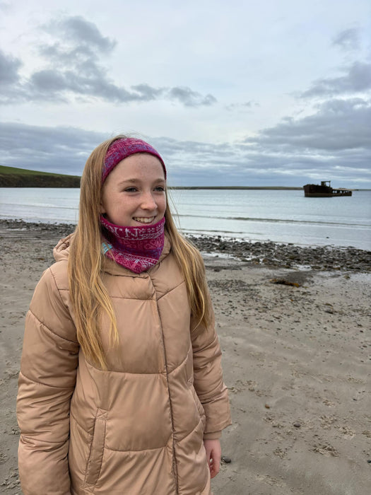 This childs headband was designed and knitted by Annie Glue, Daughter of Judith.  The design is the flower fair isle pattern, which has taken influences traditional patterns from around Orkney. This headband is made from 100% Scottish lambs wool and you can also get this as a set with a neck warmer.