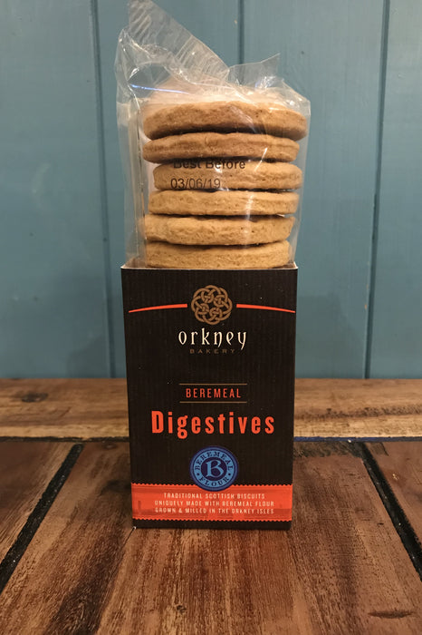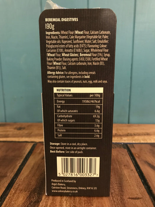 These beremeal digestives are handmade by Orkney Bakery in Stromness using Orkney beremeal flour ground at Barony Mill in Orkney.