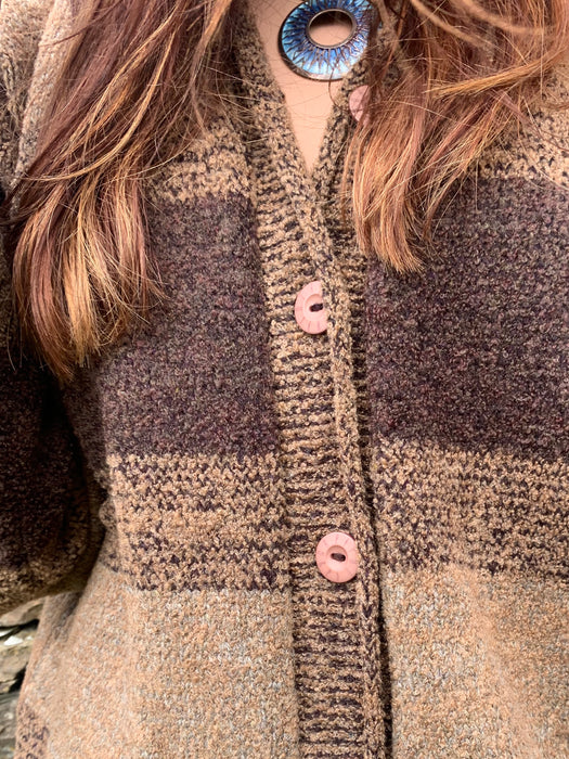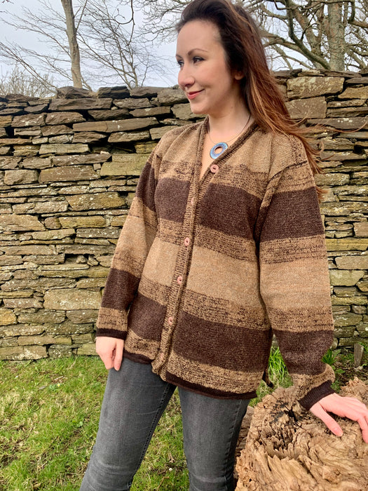 This is a brand new colourway that has just been made in our workshop called Peat. As part of the Orkney View collection, this beautiful cardigan with curled trimmed cuffs and welt and unique runic buttons reflects the colours and textures of Orkneys sandy pebble beaches . It is knitted in a luxurious soft mix of Scottish lambswool, Italian mousse and merino. The yarns are twisted together which makes each garment unique with slightly different variations of un-dulating colours and textures and very soft to wear.