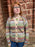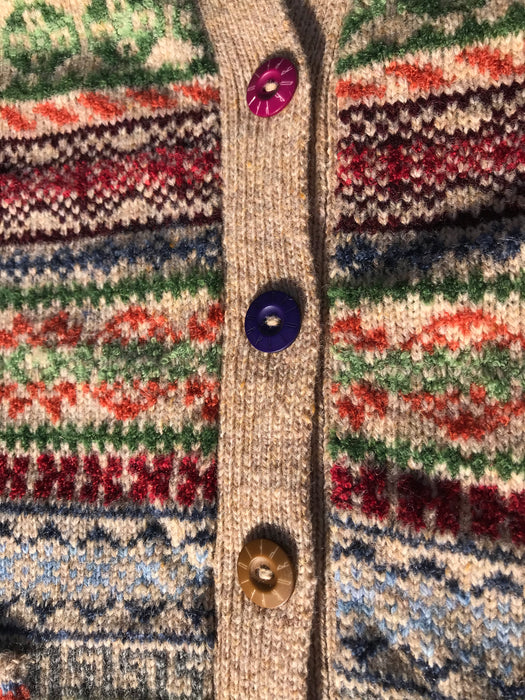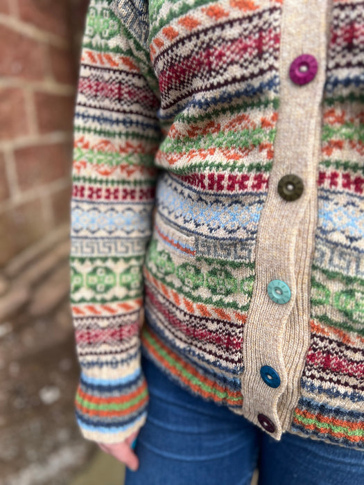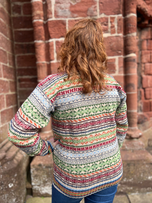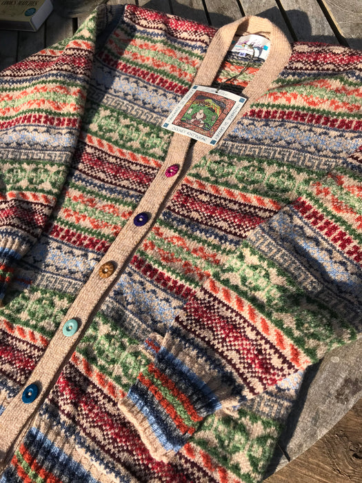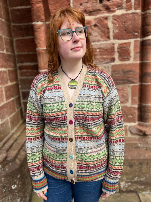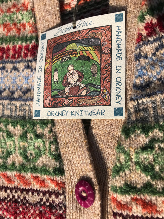 This garment has been designed by Judith Glue and the colours and textures have been influenced by memorable visits to Rackwick Valley in the Island of Hoy, Orkney's highest Island. It is beautifully made in Orkney by one of her experienced knitters based in their own home, this traditional fair isle pattern is made with Scottish lambswool with a mix of Italian boucle and mousse yarn. This V-Neck Cardigan is a longer style with a ribbed front button band with original runic buttons in assorted colours with striped welts and cuffs and two front pockets.