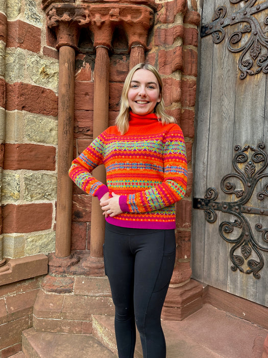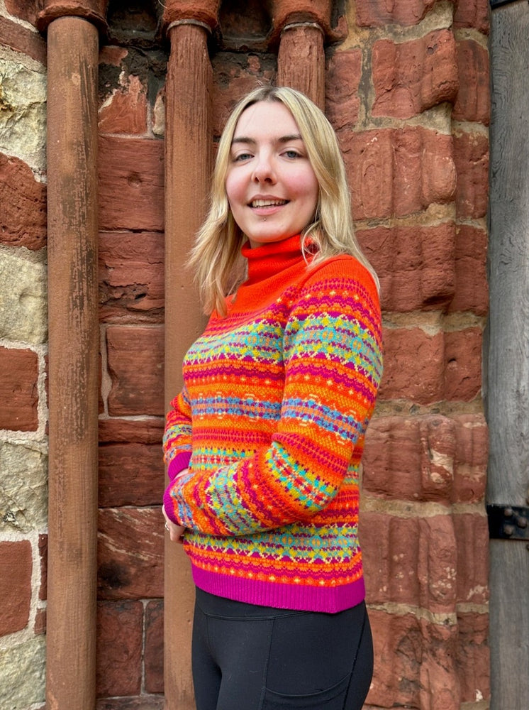 This ‘Kinross’ fair isle high neck jumper by Eribe is super soft, comfortable and on –trend this season. It has a cosy high neckline and long sleeves and features a gorgeous fair isle design of complimentary colours throughout on a stunning orange colour. It is a perfect winter warmer and will keep you cosy and stylish this season.