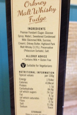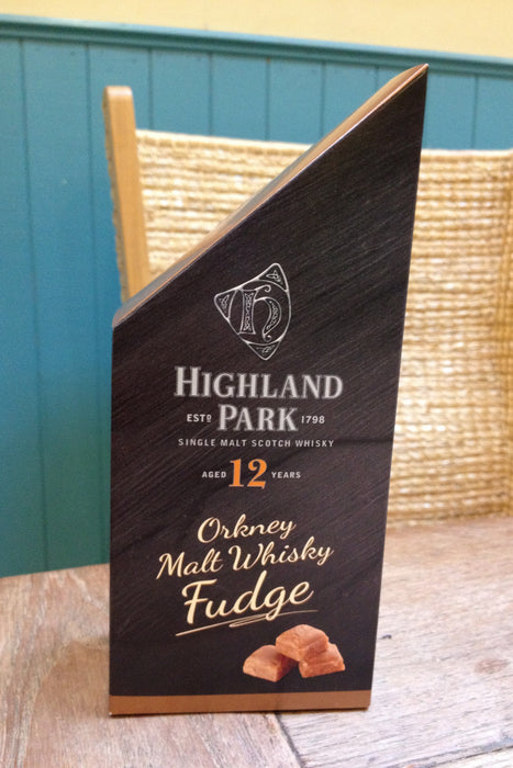 Handmade Orkney fudge pieces made with Highland Park malt whisky by Argos Bakery in Stromness using traditional methods and the finest ingredients and combining two of Orkneys most iconic brands. Beautifully packaged in a very original standing stone shaped box !