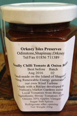 Handmade on the Island of Shapinsay this specially chilli chutney was devised by Glynis from Orkney Islands Preserves in Shapinsay  and exclusively made for Judith Glue . It is one of products that our customers love the most ! and is only available to purchase from us. Excellent served with cold meats and cheese. and has a strong sweet chilli taste and is even made using local tomatoes grown in Birsay, Orkney. Many of our customers tell us its highly addictive stuff !
