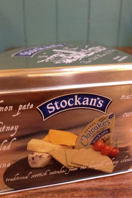 A lovely presentation triangular tin with two packets of Stockans Thin plain Oatcakes inside. Great for storing your oatcakes all year round and a brilliant reminder of Orkney. Stockans Bakery is based in Stromness, Orkney. This item only fits in our large hamper box.
