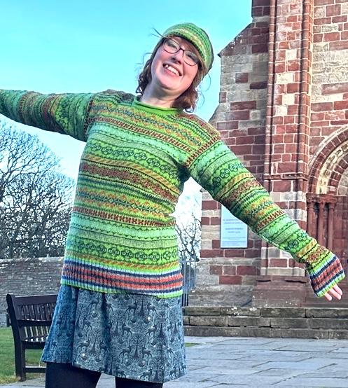 It is beautifully made in Orkney by one of her experienced knitters based in their own home, this traditional fair isle pattern is made with Scottish lambswool with a mix of Italian boucle and mousse yarn.