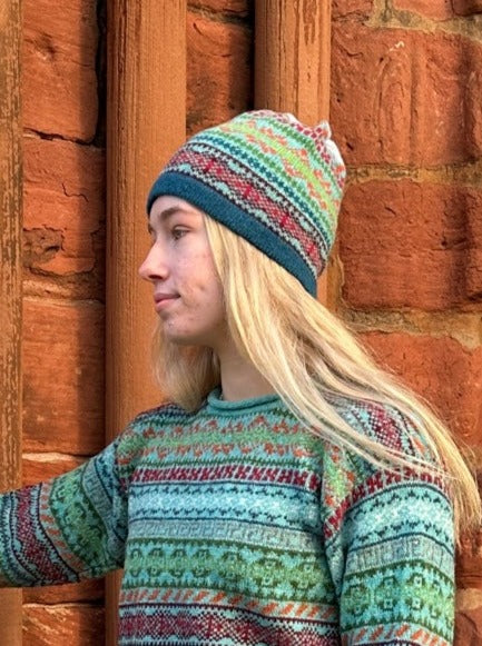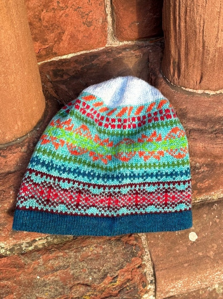 This pull on hat has been designed by Judith Glue and the colours and textures have been influenced by the shorelines of Rackwick beach and valley in Hoy, Orkney - with its blue seas, sandy beach with its amazing boulders and wild flowers and grasses