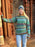 This sweater has a delicate curled neckline with striped ribbed cuffs and welt.
