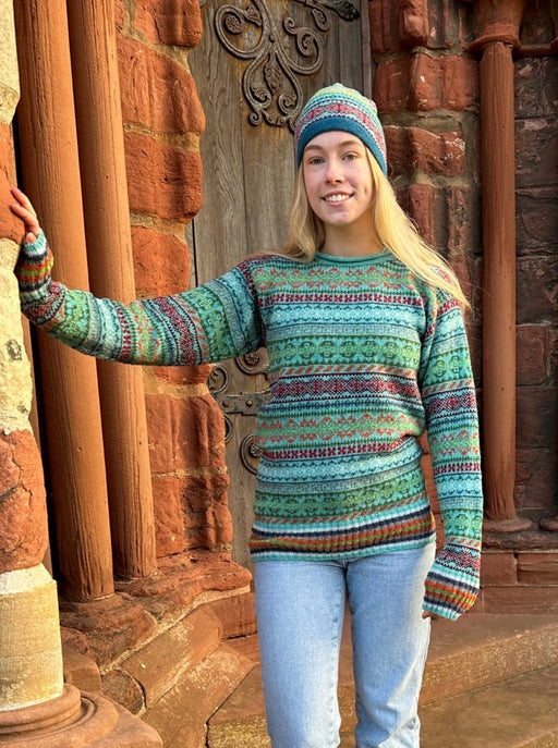 It is beautifully made in Orkney by one of her experienced knitters based in their own home, this traditional fair isle pattern is made with Scottish lambswool with a mix of Italian boucle and mousse yarn.