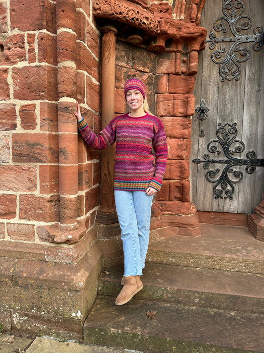 It is beautifully made in Orkney by one of her experienced knitters based in their own home, this traditional fair isle pattern is made with Scottish lambswool with a mix of Italian boucle and mousse yarn.