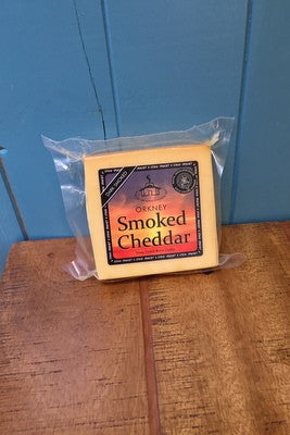 Orkney Cheddar Cheese Smoked by the Orkney Islands Smokery. This cheese is a dark smoked cheese.