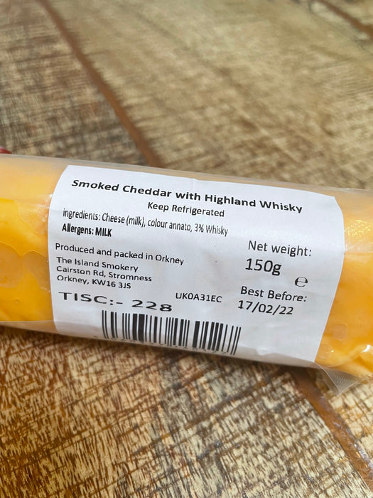 Orkney smoked Cheddar Cheese with Highland Whisky, Smoked by the Orkney Islands Smokery in stromness.