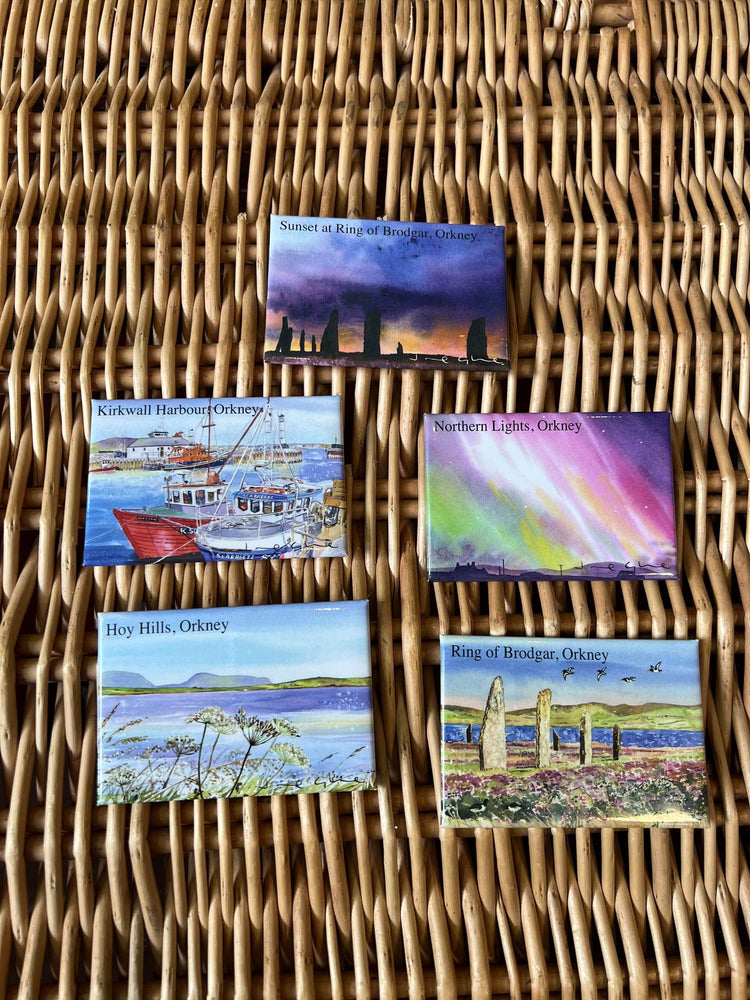The perfect little gift or memory from Orkney. Printed magnets using original Orkney inspired artworks created by Judith's twin sister, Jane Glue the famous Orcadian watercolourist.