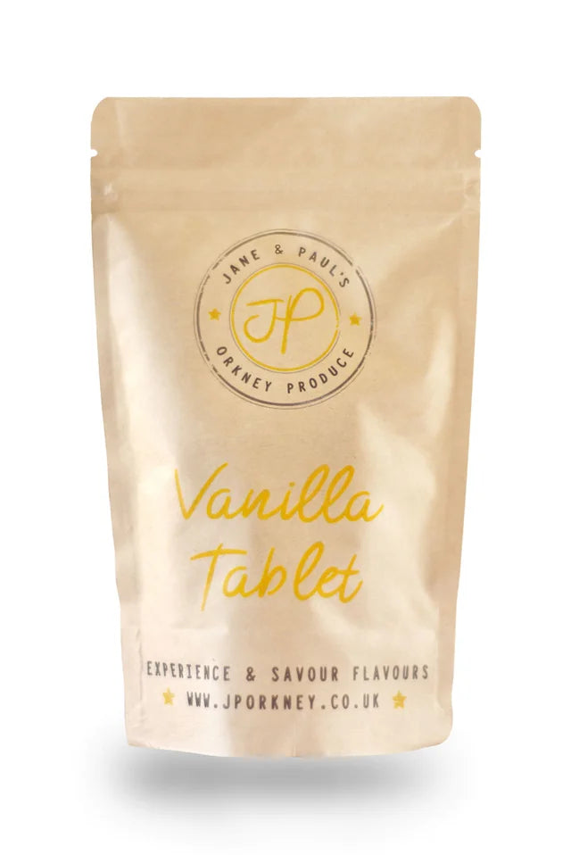 JP Orkney's Vanilla Tablet is made using Orkney butter and vanilla flavouring. Firm and sugary whilst still being smooth and creamy; once opened too tempting to close!