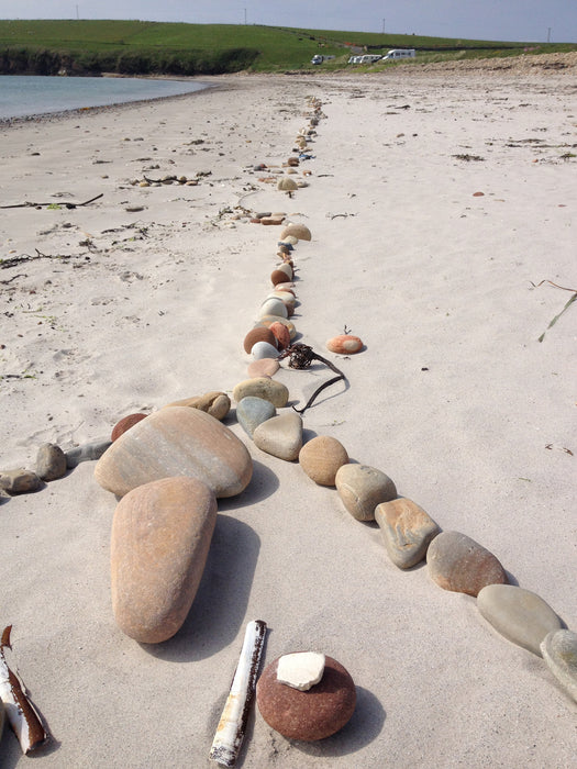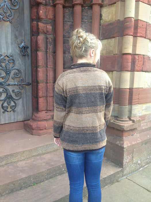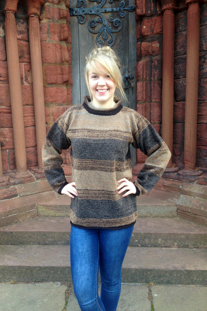 This is a brand new colourway that has just been made in our workshop called Peat as part of the Orkney View collection, this rollneck sweater with curled trimmed cuffs and welt, reflects the colours and textures of Orkneys sandy pebble beaches such as in the picture shown here that was taken in South Ronaldsay. It is knitted in a luxurious soft mix of Scottish lambswool, Italian mousse, merino. The yarns are twisted together which makes each garment unique with slightly different variations of un-dulating colours and textures and very soft to wear.