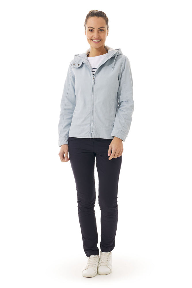Description : Women's jacket lined in canvas with hood. Cut: Mid-length fitted cut that covers the lower back well. Slimming cuts. Details : Yoke cutouts on the front and back. Straight side pockets