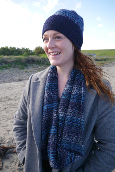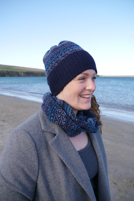 Gorgeous Stormy Seas Fair Isle pattern hat by Annie Glue, Judith's Daughter. This hat is made and designed in Orkney using Scottish lambswool and Italian Merino wool. The pattern stormy seas fair isle this design takes influences from Orkney's ever changing weather.