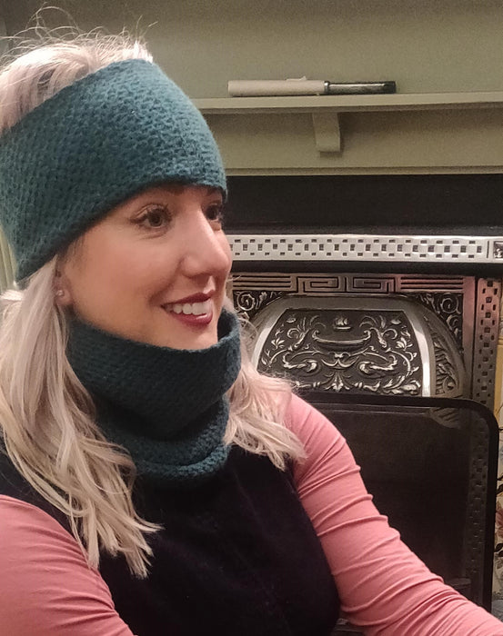 Textured headband from Annie Glue knitwear, knitted in super soft Scottish lambs wool perfect for long chilli walks this winter.  these come in a range of lovely bright colours and there are hand warmers and snoods to match.