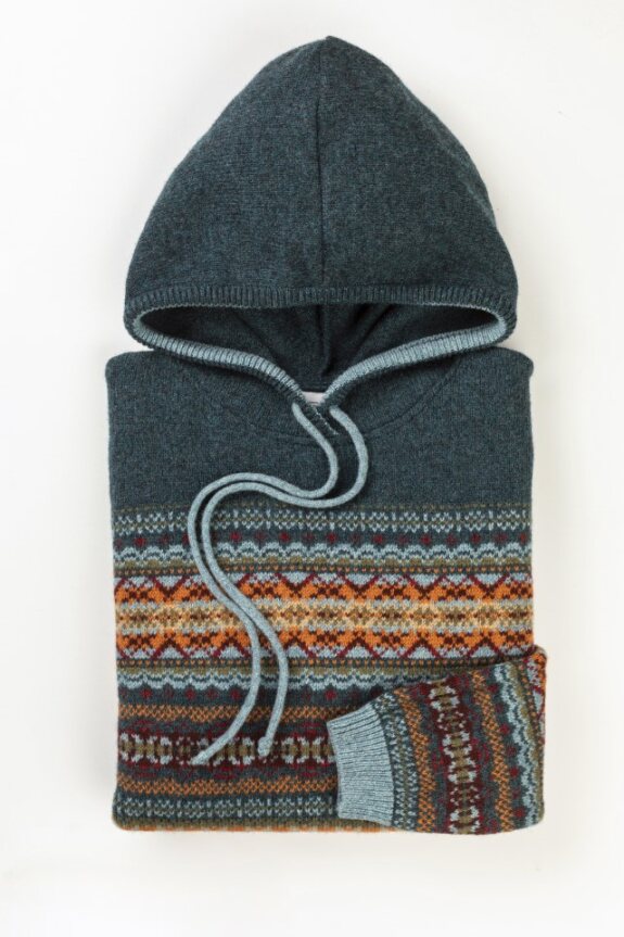 This sporty hoody sweater feels super soft and luxurious. Knitted firmer than the Kinross Sweater for extra warmth, and a glamorous alternative. With rib hems, knitted hood and wool cord.