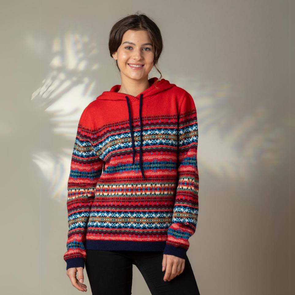 This sporty hoody sweater feels super soft and luxurious. Knitted firmer than the Kinross Sweater for extra warmth, and a glamorous alternative. With rib hems, knitted hood and wool cord.