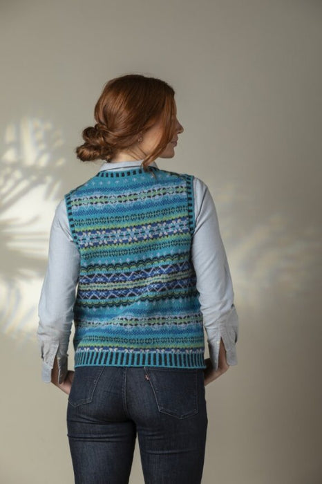 Inspired by Scottish Fairisle handknitted patterns, our modern low round neck vest features the classic striped rib hem. Knitted in Supersoft Shetland, it's lighter and softer than traditional Shetland wool, ensuring comfort and a personalized fit over time.