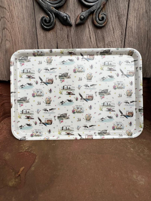 Inspired by Orkney's local wildlife with scenes from around Orkney including the Old Man of Hoy and the Ring of Brodgar. This is part of the Orkney Wildlife collection which is exclusive to Judith Glue. Displayed on the tray is also the Orcadian word for some species including the infamous Tammie Norries, Orcas, Selkies and Skeldros.