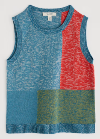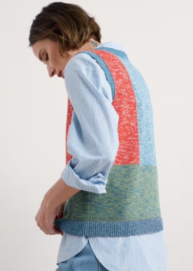 A neat fit vest that makes a colourful statement. Knitted with a pure organic cotton mouline yarn, that blends different coloured . Style over t-shirts or wear on its own.