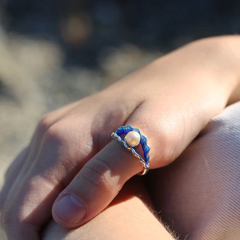This Scallop ring in sterling silver mimics the appearance of an open scallop shell, elegantly clutching a peach pearl. The textured interior edges of the shell are beautifully highlighted in Scallop Blue enamel and the 6mm pearl is expertly hand-set in our Orkney workshop.