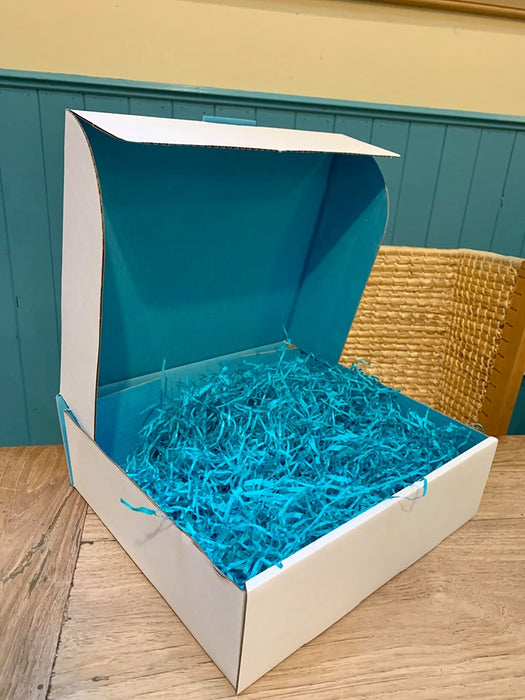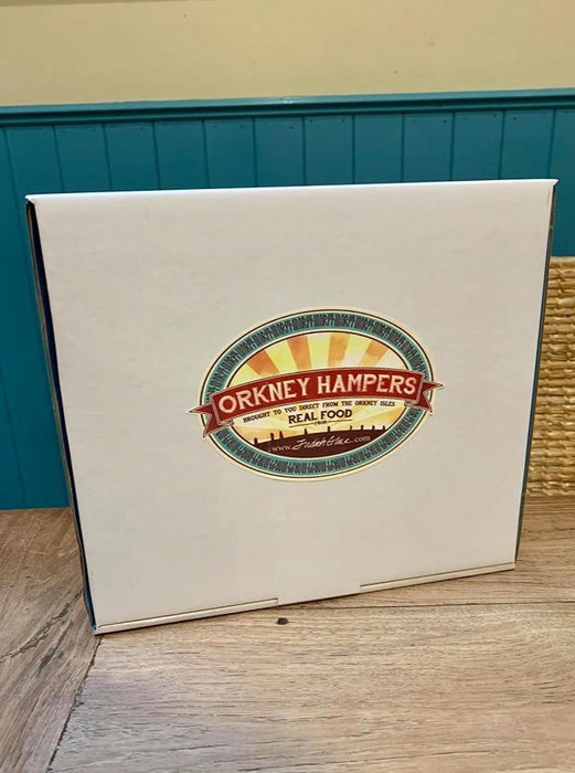 This medium Orkney Hampers cardboard box measures approx 12" x 10.5" and comes with paper crinkle inside and oval hamper sticker on the outside. You also receive a free Orkney giftcard. Order this box and choose individual food and drink items to go inside to make your box unique. You can also add any other gift items that we sell online and place your order to arrive on a specific date. Just simply fill in the date and message of your choice in the notes part when you place your order or send us a separate e-mail once you have placed your order.