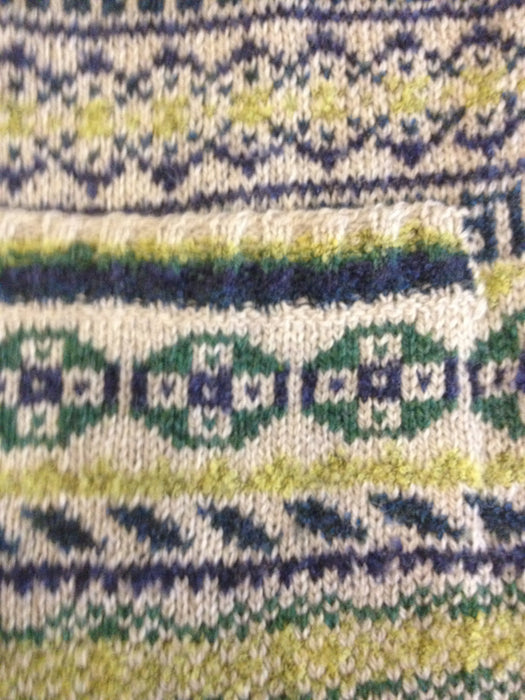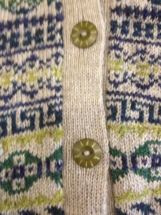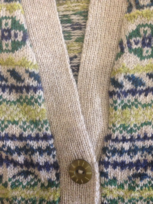 Designed by Judith and made in Orkney by her team of experienced knitters these traditonal " Peerie " design Fair Isle pattern jackets are lightweight and luxurious and are handmade in soft Scottish Lambswool and Italian mousse yarns and beautifully finished with matching individual runic buttons with two front pockets.