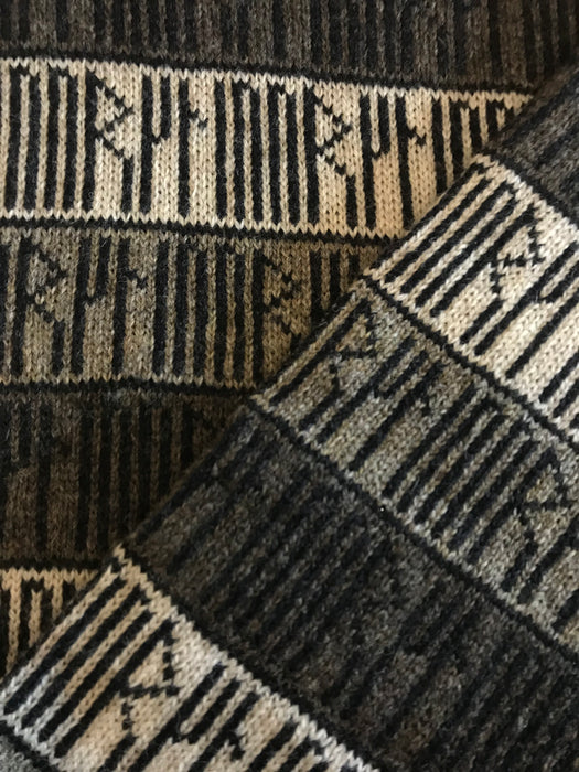 Judith designed this unique pattern in 1987 it was one of the first designs that she made. It represents Viking Runes or you could call it Viking Graffiti! Runes are found in the Neolithic tomb of Maeshowe on the Orkney mainland. Don't worry translated it simply says " Orkney" in Runic writing! This crewneck sweater is painstakingly handmade by one of Judith's Island knitters from soft Scottish lambswool, it has ribbed welts, cuffs and crew neckline.
