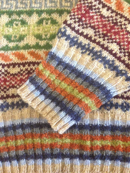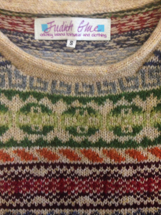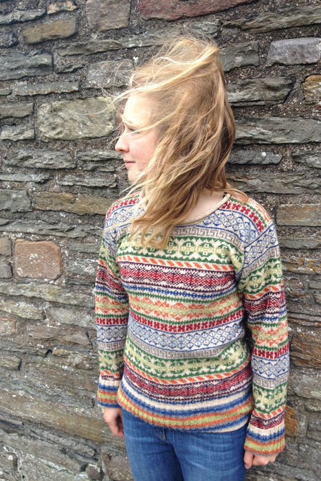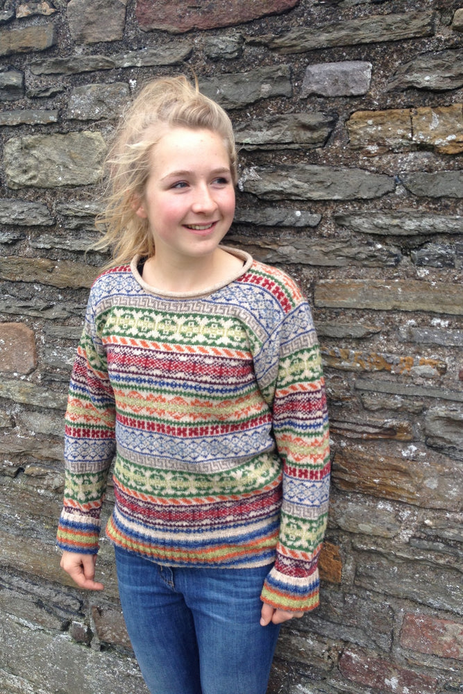 This garment has been designed by Judith Glue and the colours and textures have been influenced by memorable visits to Rackwick Valley in the Island of Hoy, Orkney's highest Island. It is beautifully made in Orkney by one of her experienced knitters based in their own home, this traditional fair isle pattern is made with Scottish lambswool with a mix of Italian boucle and mousse yarn. This curlneck sweater is a shorter style with a neat curled round neckline, striped knitted cuffs and welt.