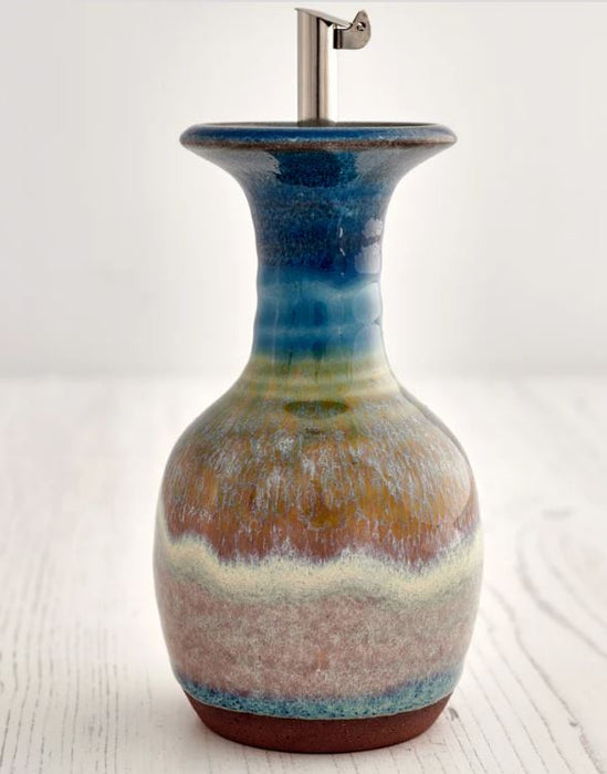An Olive Oil Decanter, just short of 13cm in height. Perfect for drizzling over salads, with a stainless steel flip top pourer. Holds approximately 150ml. Each piece is made on a potters wheel and hand glazed, therefore size and colours may vary slightly.