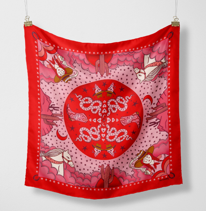There are lots of quirky details on this vibrant red and pink square...stars, cacti, mountains, skulls, boots and snakes...and it's edged by a stars and horseshoe border. These pocket squares are approx 44cm square which make them generously sized enough to wear as a small neckerchief.