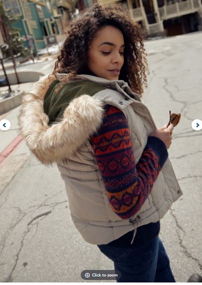 The Sabine Arctic padded gilet is absolutely packed full of features. Super-warm thanks to its padding, with a fleece lined hood and pockets. It has a full zip entry with a fun metal fish zipper, plus a popper fastened storm flap for added protection from the wind. The pockets have popper fasteners, and the waist has draw cords, so you can synch the bottom in to your liking. The fun faux fur trim is buttoned on, so can be detached, or you can take the whole hood off with the popper fasteners, if you want to wear this gilet without it sometimes. Finished with a pretty, printed floral lining, this gilet can take you through transitional months into Winter, just switch your shirt or lightweight knit to a chunky jumper.